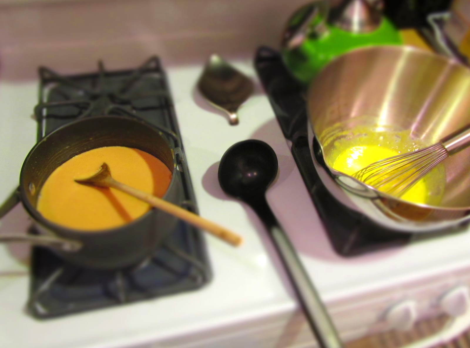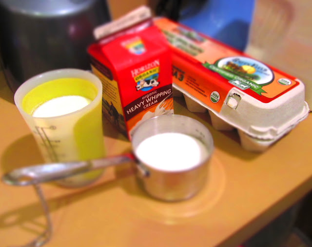 Set the measured cream by the stove so it’s at hand when you need it. Measure out 1/2 cup of the sugar and keep near the stove; you’ll use this for the caramel (the rest will go in with the yolks).