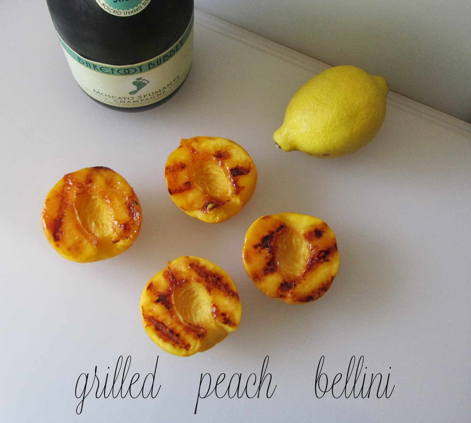 As I giggled and danced around the kitchen, I saw the last two beautiful ripe peaches in the fruit bowl. I saw a grilled peach salad on a blog I like to read the other day, and I thought to myself, hmm. Why not grill the peaches prior to smashing them up to mix with my bubbly.. surely it will caramelize the fruit and give an added smoky-sweetness to an already brilliant beve, right?