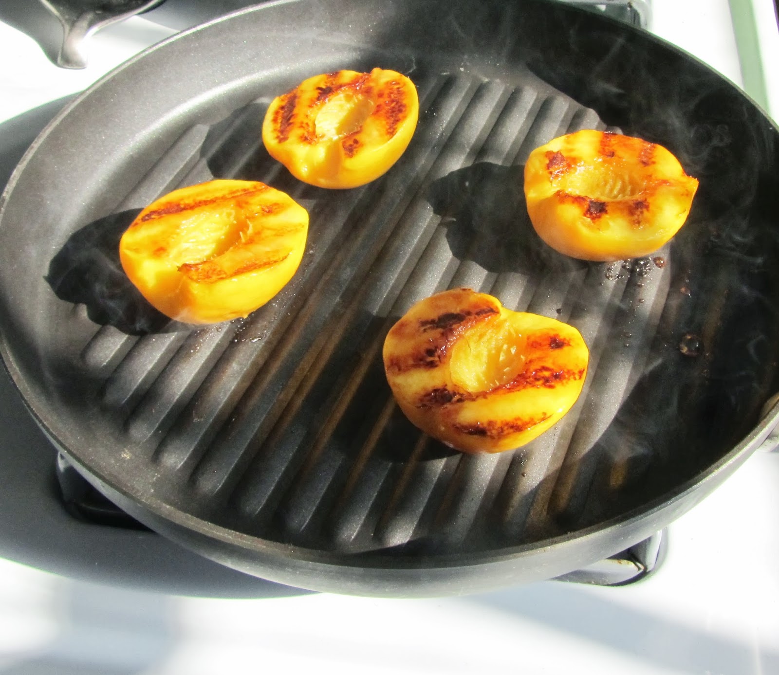 Sprinkle peach halves with sugar on both sides and grill 1-2 minutes on each side over high heat. The sugar will start to burn/smoke a bit so be careful, and open a window.