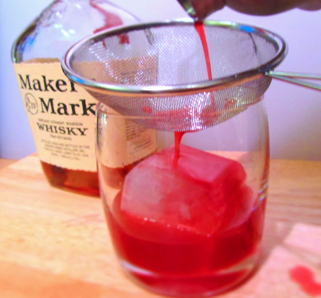 Shake for 45-60 seconds and strain into a glass. I added a giant ice cube to elongate my chilled beve sipping pleasure. This keeps it cold without watering it down.