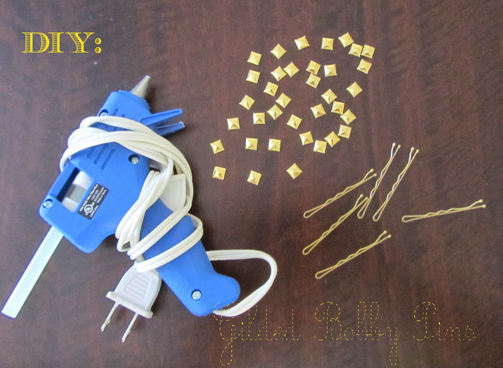 I bent the bobby pin open, put a dab of hot glue on the back of the gem, and placed it on the flat side of the bobby pin. Wait about 3 seconds, just so it slightly cools, then push your finger into the dollop of glue so it flattens around the bobby pin. You want to fully encase the bobby-pin in glue, otherwise the gems will fall off.