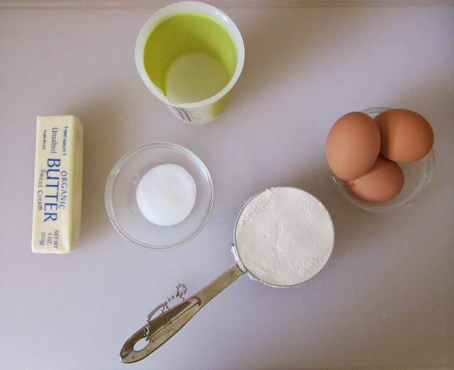 this recipe. I’ve been wanting to tackle these little suckers for quite some time. Pate a choux is a fascinating dough. It’s the above ingredients. Simple. But you basically boil the water butter sugar salt together, then whisk the flour into it over the heat.